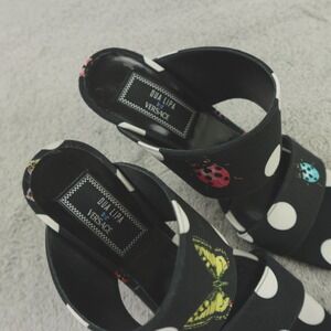 Versace x Dua Lipa Heels Womens 37 7 US Dot Butterfly Dual Band Stiletto Sandals Open Toe Mule. Excellent pre-owned condition, worn once, original MSRP of $850. Minor wear to the soles/bottoms as pictured, no stains, tears, or other signs of wear noted, please review all photos. See photos for measurements. Thanks for visiting!