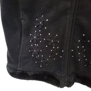 Northern Reflections Women’s Fleece Vest Black Faux Fur Trim Winter Cozy Warm Sparkle Flowers -Brand: Northern Reflections -Size: Small (Please check the approx. measurements to ensure a good fit) -Colour: Black -Details: * Cozy & comfortable fleece * Stand faux fur collar * Faux fur along bottom hem * Sleeveless * Center front zip closure * Two front pockets * Embroidered dots & 3D flowers with gemstones on front & back -Fabric Content: 100% polyester -Care: Machine wash -Approximate Measurements: Lying flat and unstretched, not a guarantee of fit. Length: 23.5“ (shoulder to hem) Width: 19“ (armpit to armpit) Hem: 20.5” -Condition: Pre-loved with medium wear. Signs of wear include some all-over fabric wear/pilling/fuzzies from use as shown in photos. Most noticeable around underarm area and interior of vest. Also, one small spot near bottom where fleece is worn thin. Please review all photos carefully. Good vintage condition! -Comments: AI model photo included for style reference only. There may be some color variations in pictures due to lighting. Style Tags: Warm, Fleece, Floral, Gems, Embroidered, Cozy, Comfortable, Layer, Gift, Grannycore, Grandma, Soft, Timeless, Classic, Casual, Mountains, Country, Cottagecore, Outdoors, Cabin, Winter, Fall, Season, Skating, Skiing, Neutral, Ski, Snow, Comfy, Holiday Vintage, Retro, Boxy, Staple, Layering, Sleeveless Jacket Offers Welcome, Bundle & Save!