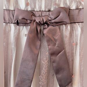 My Michelle Brown with Bronze Glitter Dress. Mesh with glitter top, bow in front, glitter patterned flowy skirt. Tie in back
