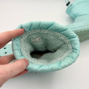 Light blue croc snow boots.