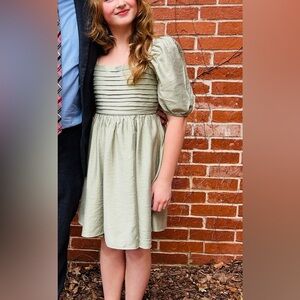 EUC Blu Pepper Sage Green Dress size M with gorgeous details. Pleated square neck bodice. Puff sleeves. Hits above knee. Perfect for dances, church, holidays, nights out. Feminine and sweet and modest. Lined. Fits a size 14/16 or women’s S with room. Fits size M more fitted.