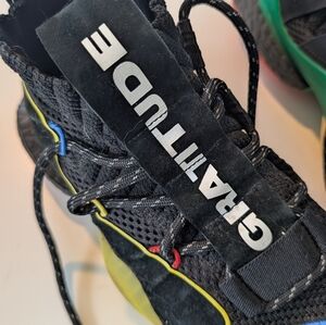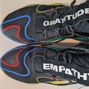 Design Details: The large suede panels on the tongue are adorned with the words "GRATITUDE" on one shoe and "EMPATHY" on the other. Crew sock elastic style high top ankle.