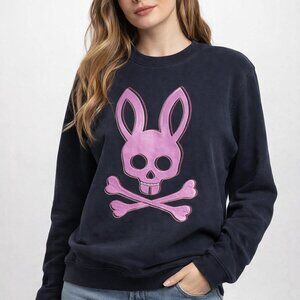 Tag: psycho bunny sweatshirt, skull bunny, graphic sweatshirt, crewneck pullover, streetwear sweatshirt, black sweatshirt, pink logo, skull graphic, designer streetwear, casual pullover, unisex style, edgy fashion, modern street style, athleisure wear