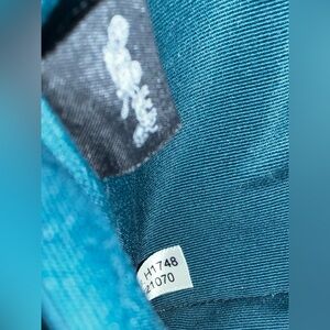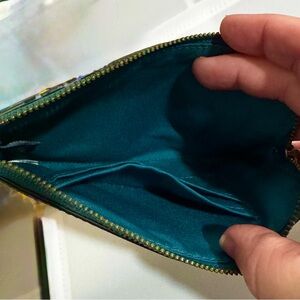 Elegant Coach wristlet in metallic teal. Ideal for carrying essentials.