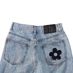 Distressed denim with a playful twist: these BDG jeans feature a light wash and a relaxed, wide-leg silhouette. Rips at the knees add an edgy, deconstructed vibe, while the flower patches in solid black and a subtle plaid pattern bring a touch of whimsy and charm. The high-waisted design ensures a flattering fit, making these jeans a statement piece that's both comfortable and stylish. Perfect for casual outings, music festivals, or adding a unique touch to your everyday wardrobe.