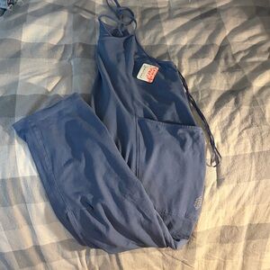 Stylish navy jumpsuit with a relaxed fit. Features thin straps and convenient pockets. Ideal for casual outings.