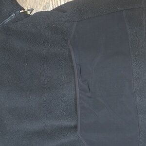 Black fleece jacket.. front zipper closure.. long sleeve with zip off sleeves making into vest.. high collar.. pockets with zipper closure. top pocket with zipper closure.. back open mesh pocket...drawstring elastic waistband..