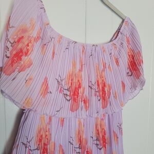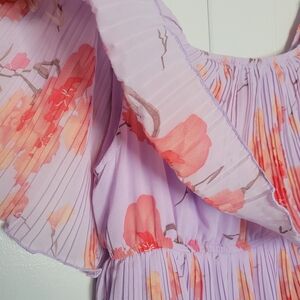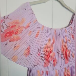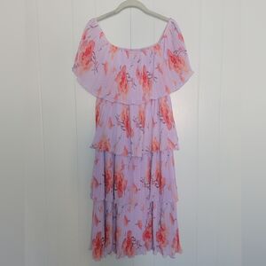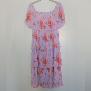 Entro Off Shoulder Tiered Plisse Pleated Midi Dresa Floral Lavender & Pink MD
