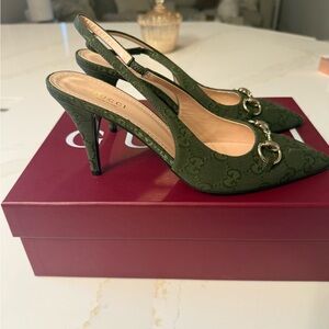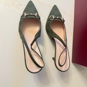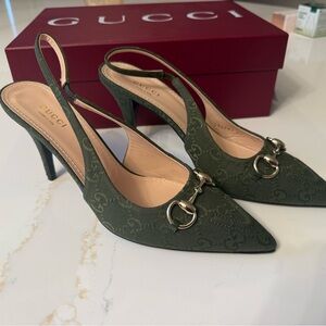 GUCCI SLINGBACK PUMP HORSEBIT GREEN CANVAS 38