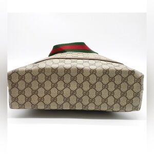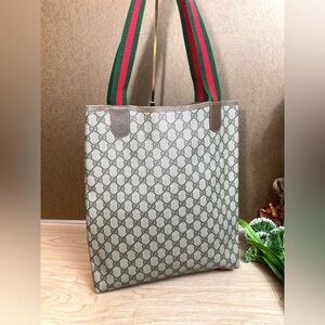Stylish Gucci tote with iconic pattern. Features red and green striped straps. Perfect for everyday elegance.