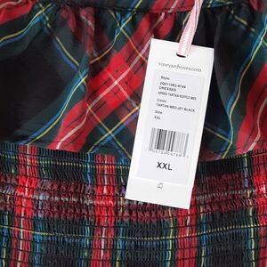 Elegant tartan dress with ruffle accents. Features red, green, blue, and yellow pattern offset with a black background.