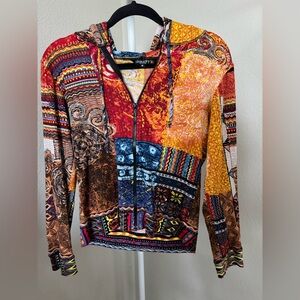 Eye-catching Chaudry Sport patchwork zip-up jacket featuring a vibrant orange, red, blue, and brown boho print throughout. This lightweight hoodie has a black front zipper, attached hood, and subtle scattered sequin accents that add dimension and sparkle.