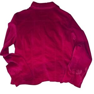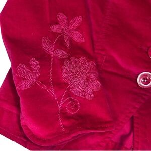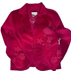 Add a pop of color to your wardrobe with this Live a Little women’s blazer jacket in a striking deep pink velvet-like fabric. Finished with tonal floral embroidery on the front and sleeves, this piece combines feminine details with a tailored silhouette. The plush, velvety texture gives it a luxe look and feel while still being comfortable with a hint of stretch. Classic Y2K cottagecore meets western-boho chic. New without tags. NWOT