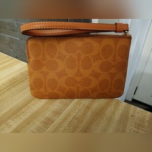 Stylish Coach wristlet in vibrant orange. Features signature pattern. Perfect for any occasion.