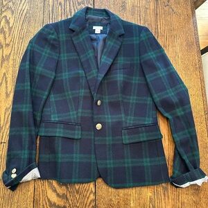 Stylish navy and green plaid blazer. Ideal for versatile wear. Classic design with a modern touch.