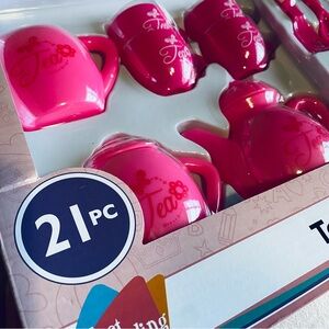 21 piece pretend pink play tea set. Kids, toddlers, girl. Perfect for imaginative play, this set includes everything needed for a fun tea party.