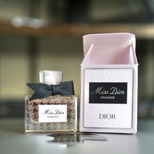 Chic Miss Dior Essence bottle. Adorned with a black bow. Accompanied by a stylish pink box.
