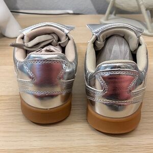 Stylish Steve Madden sneakers. Metallic silver finish. Comfortable lace-up design.
