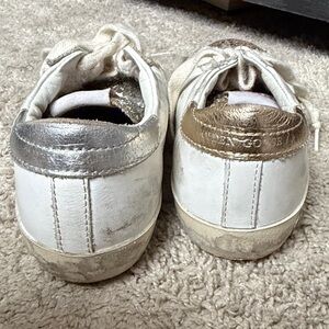 Golden Goose sneakers with white leather and silver glitter. Features star design and lace-up style.