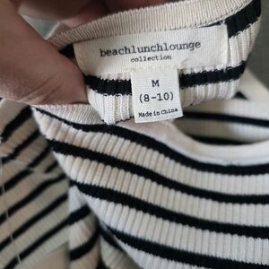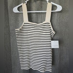 Elevate your summer wardrobe with this Beach Lunch Lounge tank top in classic black and cream stripes. The square neckline and slim fit add a touch of sophistication to this basic style, making it perfect for a day at the beach or a chic Parisian-inspired look. The ribbed texture adds subtle dimension and the soft, comfortable material ensures all-day wearability. This tank top is brand new with tags and is a size M, fitting true to size for regular sizing. Add a touch of beachy vibes to your wardrobe with this versatile top. There are a couple dust marks but they should come out in the wash.