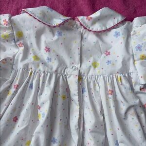 The Beaufort Bonnet Company collared dress with Lining and bow back. Dainty scallop edging detail and trim. Comes with matching bloomers. This is perfect for spring! I think we wore once for Easter. Photographs beautifully!