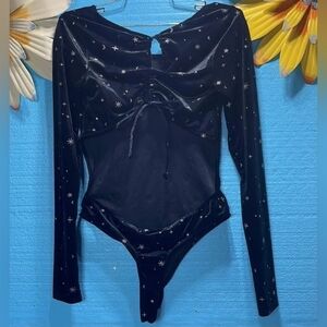 Whimsigoth Open Back Celestial Velvet Bodysuit in Midnight Black