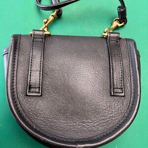 I found another small bag in my closet that could use a new home. This one is the Black Glove Tanned leather with brass fittings and Pull snap closure. Just 6 by 4 inches and about 2 inches thick, It has a long thin removable shoulder or cross body strap that is about 50 inches. Also, you can remove the strap and string it through the back loops onto a belt. No lining but a separate pocket outside under the flap closure.