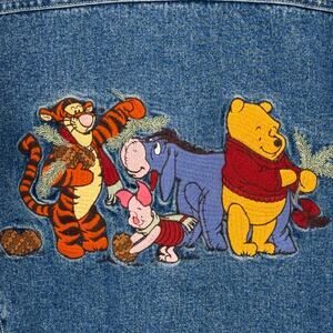 Adorable and rare vintage denim jacket featuring embroidered Winnie the Pooh, Tigger, Piglet, and Eeyore on the back. Classic "Pooh’s Knotty Pine Trail" patch on the front chest pocket and pinecone embroidery across the chest line.