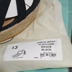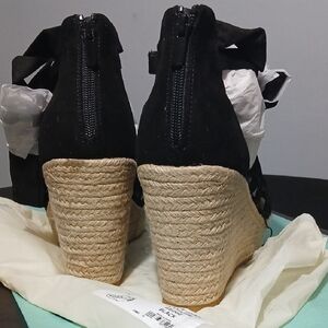 Chic black wedges with strappy design. Features a comfortable woven platform with a wrap around strap to tie up the leg / ankle. Wedge height approx. 4 inches. Brand new in the bag with tags.