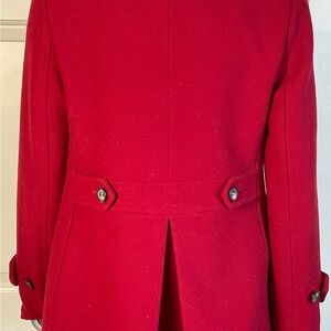 This is a Talbots Wool Blend Double Breasted Pea Coat in size 6 for women. It is a mid-length coat in red with button closure and long sleeves. The outer shell material is a wool blend tweed, and the lining is made of polyester. The coat features black buttons and has a classic, colorful city theme. Ideal for winter and fall seasons, this coat is designed for casual occasions.