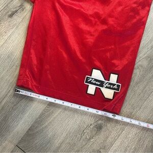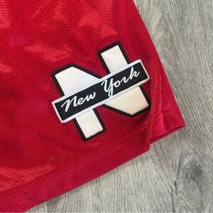 Item: Mens athletic shorts in red mesh polyester with a bold New York N logo patch on the leg.