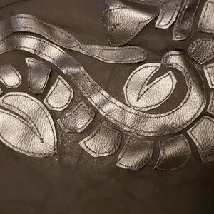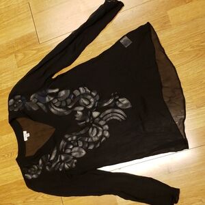 Long sleeve sheer black v-neck top with black vegan leather applique pattern. Excellent pre-owned condition. 19 in pit to pit and approximately 27.5 in shoulder to hem.
