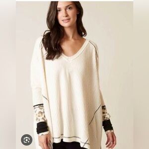 We the Free " loving leopard" sweater featuring a V-neck design. Leopard print accents on the sleeves add a trendy touch. Size XS