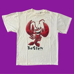 White tee with a big red cartoon lobster graphic and “Boston” text.