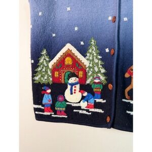 Marisa Christina The Christmas Collection 2001 sweater vest in a blue gradient. This sleeveless knit features a charming winter scene with a gingerbread house, snowman, children playing, and a horse-drawn sleigh. The v-neckline and button-front closure offer classic styling. Small white snowflake-like motifs are scattered across the upper portion of the vest and the back.