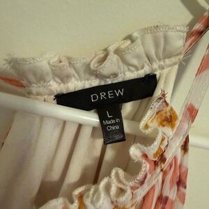 Drew for Anthropologie sleeveless maxi dress with a soft pink and ivory floral print. Features a flowy tiered silhouette with ruffle trim and a feminine tie-back neckline. Lightweight chiffon-style fabric and fully lined for coverage. A timeless boho statement perfect for warm-weather events or everyday elevated wear.