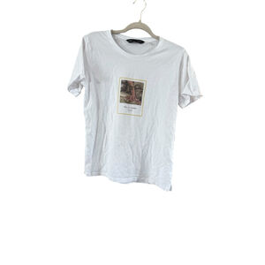This is a white, short-sleeve t-shirt from Stella Lavinia, made from 100% organic cotton. It features a rectangular graphic on the front with a gold border, depicting a close-up image of hands. The shirt has a crew neck and a straight hem. A size "S" tag is visible, along with a "Stanley/Stella" brand tag. The approximate chest width is 18.5 inches, and the length is about 25.5 inches. The shirt appears to be in new condition. 435