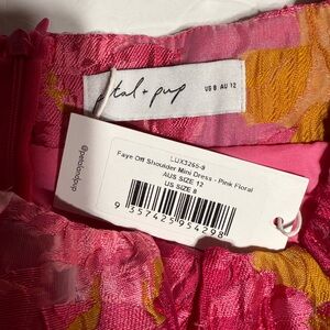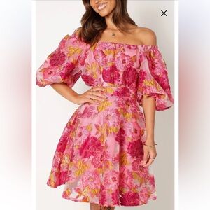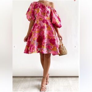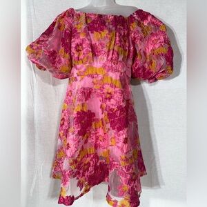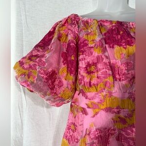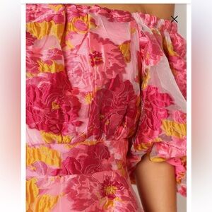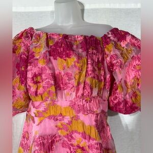 Embrace elegance with this stunning off-shoulder dress, featuring a vibrant floral pattern in pink and yellow. Perfect for any occasion, this dress combines style and comfort effortlessly.