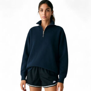 Easy and quietly cool — these black running shorts and oversized navy hoodie nail that off-duty, clean-girl energy we all crave. Think morning coffee runs or after-gym errands, when the breeze hits just right. The generous A-line cut on the shorts flatters without clinging, and the bright white piping adds that crisp, sporty track contrast that is so in right now and a snap back pocket to stow small essentials. Comfy canvas drawstring waist ties. Paired with a slouchy, borrowed-from-him sweatshirt, it’s a look that says I didn’t try, but I still look good.