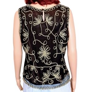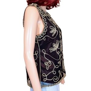 Deep chocolate brown with gold embroidered piping design. Lovely for dress up occasion or cool casual with jeans. Excellent condition.