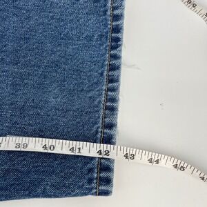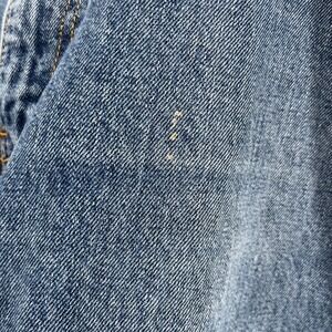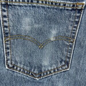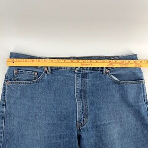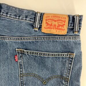 Levi Strauss 550 Relaxed Fit Jeans in a classic blue denim wash. These jeans feature a comfortable relaxed fit, five-pocket styling, and a zip fly with button closure. The iconic Levi's Red Tab is present on the back pocket, along with the signature Arcuate stitching. The hem has a distressed, raw edge finish. Some wear and stains. Please see all pictures before purchasing.