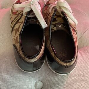 Chic Coach sneakers with signature tan monogram. Features white laces and black trim.