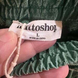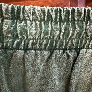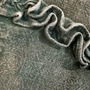 Brand new with tags. Green wide leg pants with ruffles. Pockets in front with ruffle detail. Elastic waist with tie. Material is mineral washed green.