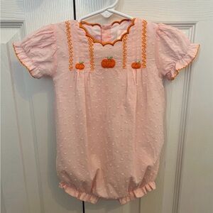 Cecil and Lou adorable pink baby romper featuring cute pumpkin embroidery and orange trim. Perfect for fall festivities. Size 6 months. SFH