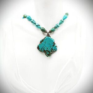Vintage sterling silver and Hubei turquois 1 6/8" x 1.5" pendant and beads necklace is 16" long with hand forged hook and eye clasp.