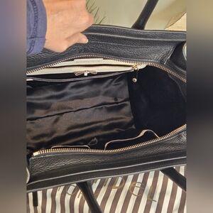 The black fabric lined interior has the iconic Henri Bendel signature bow with brown and white stripes. There are slip pockets and a zip closure pocket inside to help organize your items.