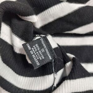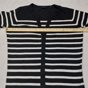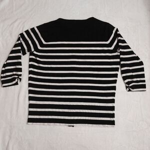 Cyrus Women 3/4 Sleeve Cardigan Size 1X. Black and white stripes. Button detail on cuffs. MEASUREMENTS PROVIDED.