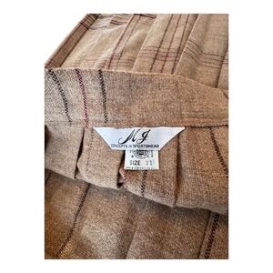 Keywords: plaid skirt, pleated skirt, midi skirt, tan skirt, striped hem, vintage style, classic silhouette, fall fashion, workwear, casual skirt, size 11 skirt, button closure, textured fabric