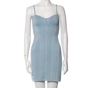 Chic light blue mini dress by Herve Leger. Features a textured pattern and strapless design. Ideal for stylish outings.