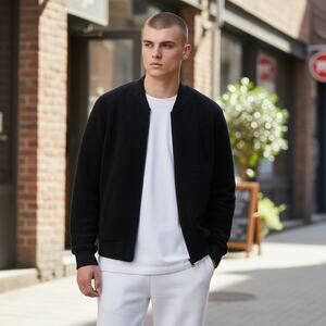 Elevate your wardrobe with this sleek and versatile Express knit jacket. This lightweight zip-up is perfect for layering and adding a touch of modern style to any outfit.